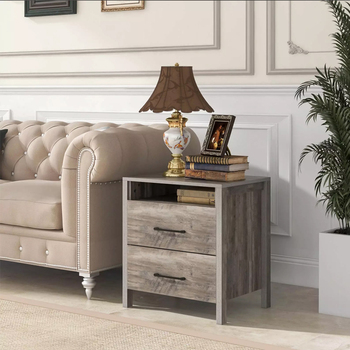 Comodino rustico in legno grigio con gambe in metallo per mobili in stile industriale